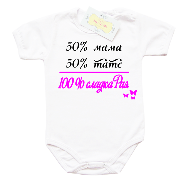 Искате ли да направите разкошен подарък на малко момиченце и едновременно с това да направите комплимент на неговите родители? С радост ви съобщаваме, че вече е възможно. Създадохме красиво моделче бебешко боди с надпис „50% мама, 50% тати, 100% сладка“.